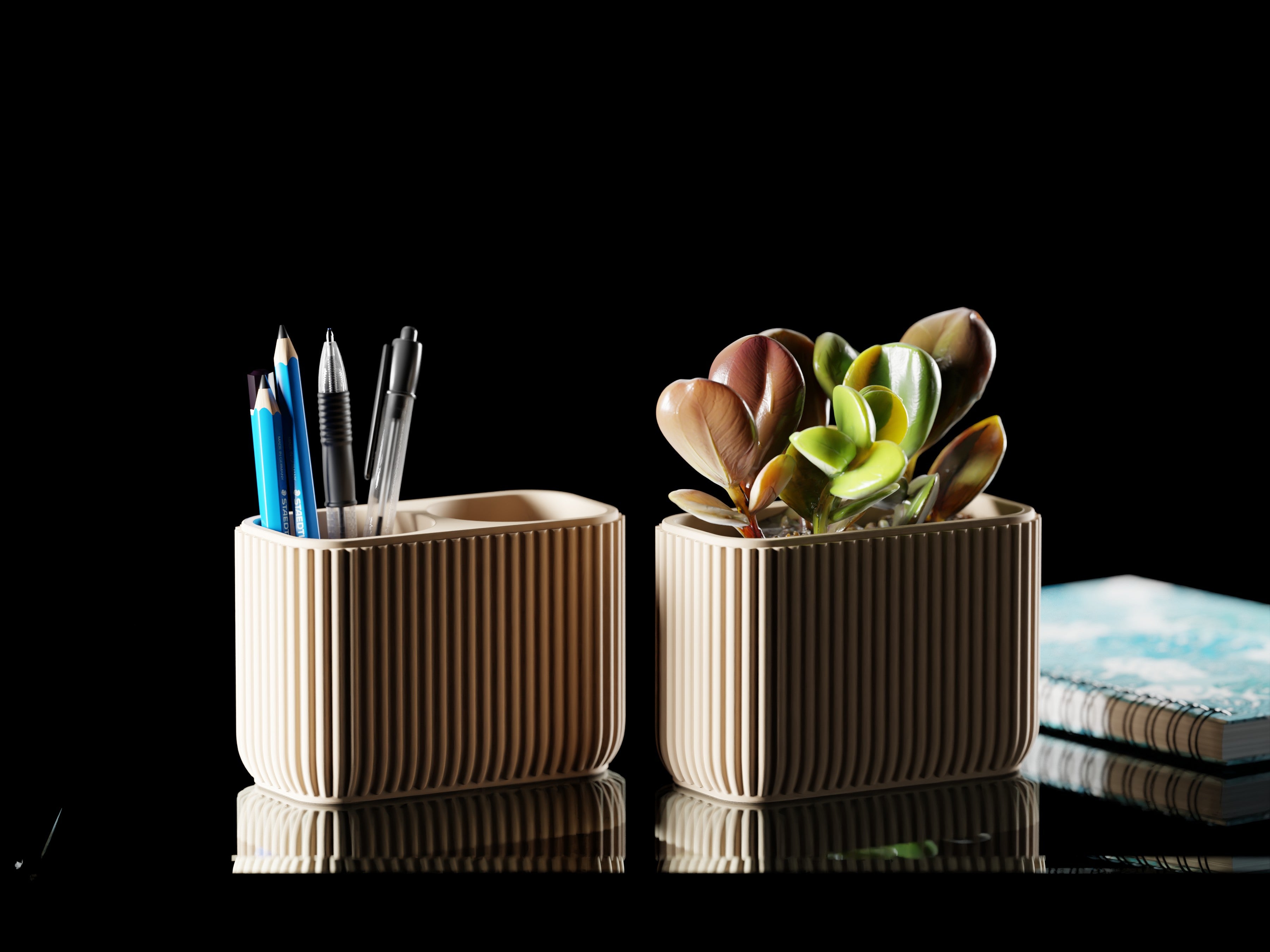 Das Set besteht aus zwei Varianten. Der Dual-Organizer mit zwei Fächern eignet sich hervorragend für Stifte, Pinsel oder kleine Werkzeuge, während der Single-Organizer mit seinem größeren Fach ideal für Pflanzen, größere Utensilien oder als dekoratives Gefäß genutzt werden kann. Beide Versionen ergänzen sich harmonisch und lassen sich vielseitig kombinieren.