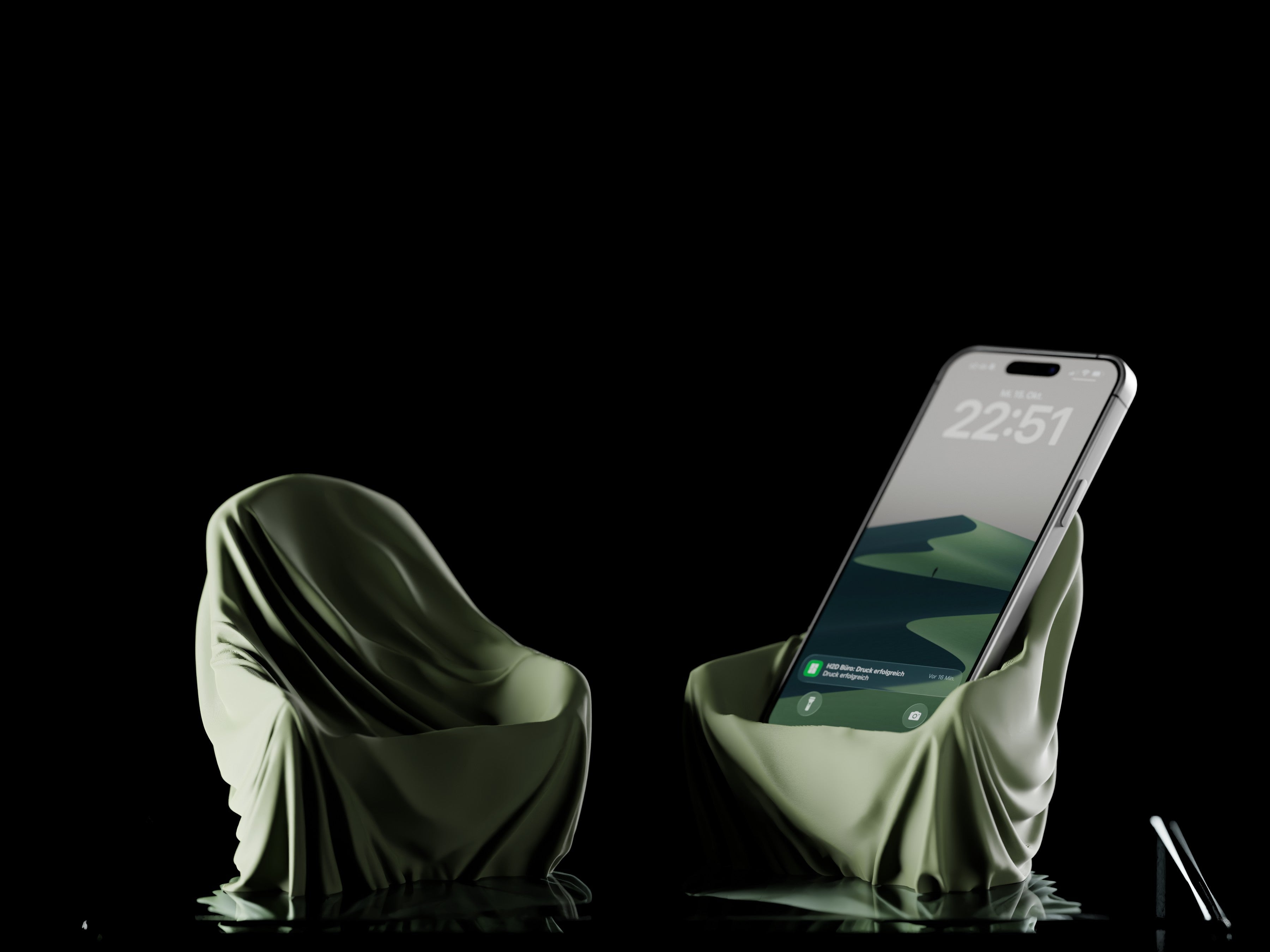 Das Design spielt mit der Idee eines Tuches, das sich über einen unsichtbaren Sessel legt und dem Smartphone einen Platz bietet, der gleichzeitig skulptural und praktisch ist. Ob auf dem Schreibtisch, Nachttisch oder Sideboard – Seraphon bringt Ruhe und Eleganz in jeden Raum und setzt dein Smartphone mit außergewöhnlicher Leichtigkeit in Szene.